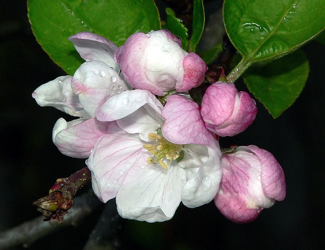 Apple blossoms on the dwarf MacIntosh tree in my back yard, taken after a spring shower