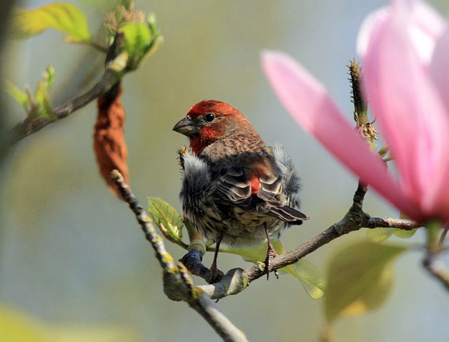 A house finch perched in a flowering magnolia at Juanita Bay Park